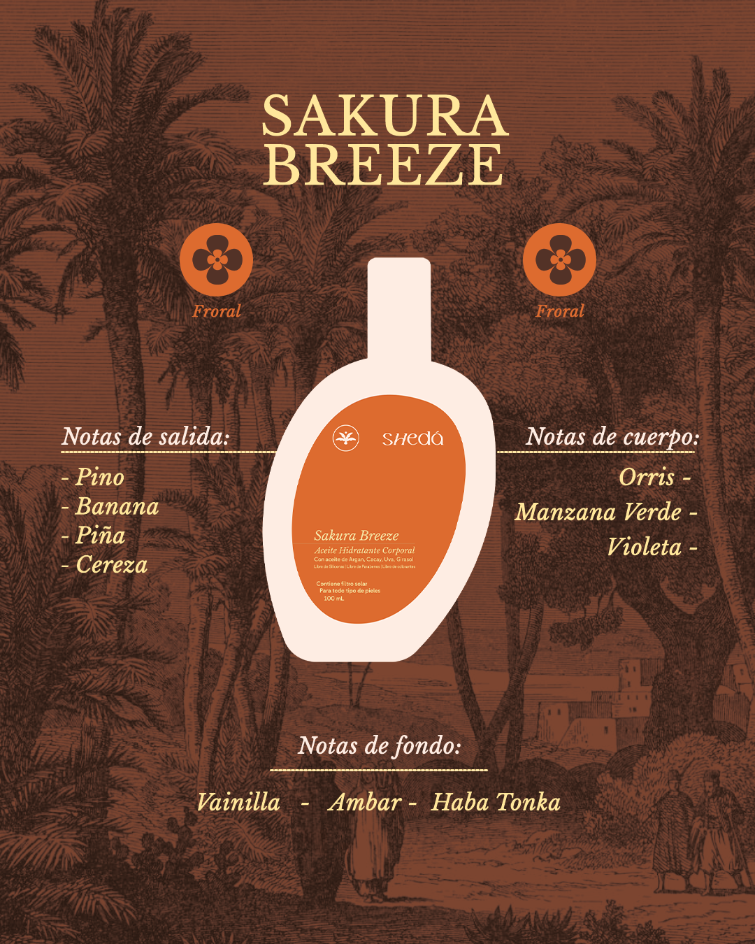 El Aceite Hidratante Corporal Sakura Brezze Shedá es un elixir de nutrición intensa que despierta la belleza natural de tu piel. Su fórmula combina aceites de argán, cacay, uva y girasol, seleccionados por sus potentes propiedades emolientes, antioxidantes y reafirmantes.